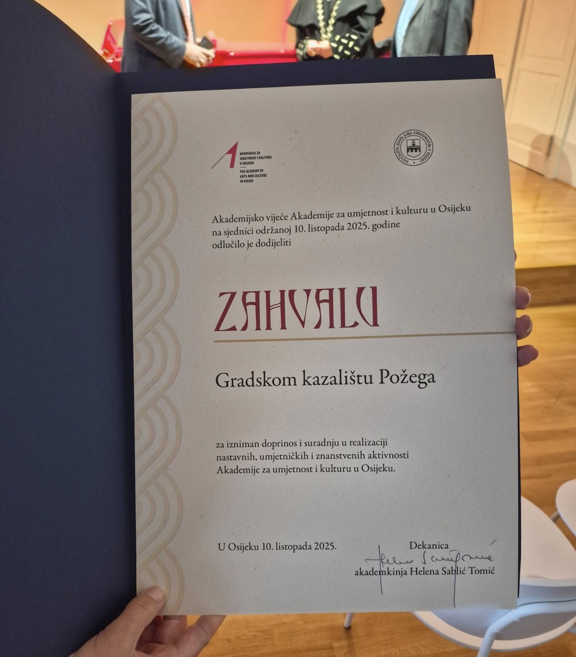 Današnji dan u Osijeku obilježen je velikim jubilejem – 20 godina od osnutka Akademije za umjetnost i kulturu u Osijeku (AUKOS). Akademija je proslavila dva desetljeća stvaranja, obrazovanja i umjetničkog djelovanja kroz niz kulturnih programa i svečanih događanja. U ime Gradskog kazališta Požega svečanosti je nazočila ravnateljica prof. Valentina Neferović, koja je tom prilikom primila zahvalu dekanice akademkinje Helene Sablić Tomić, za dugogodišnju uspješnu suradnju između kazališta i Akademije.