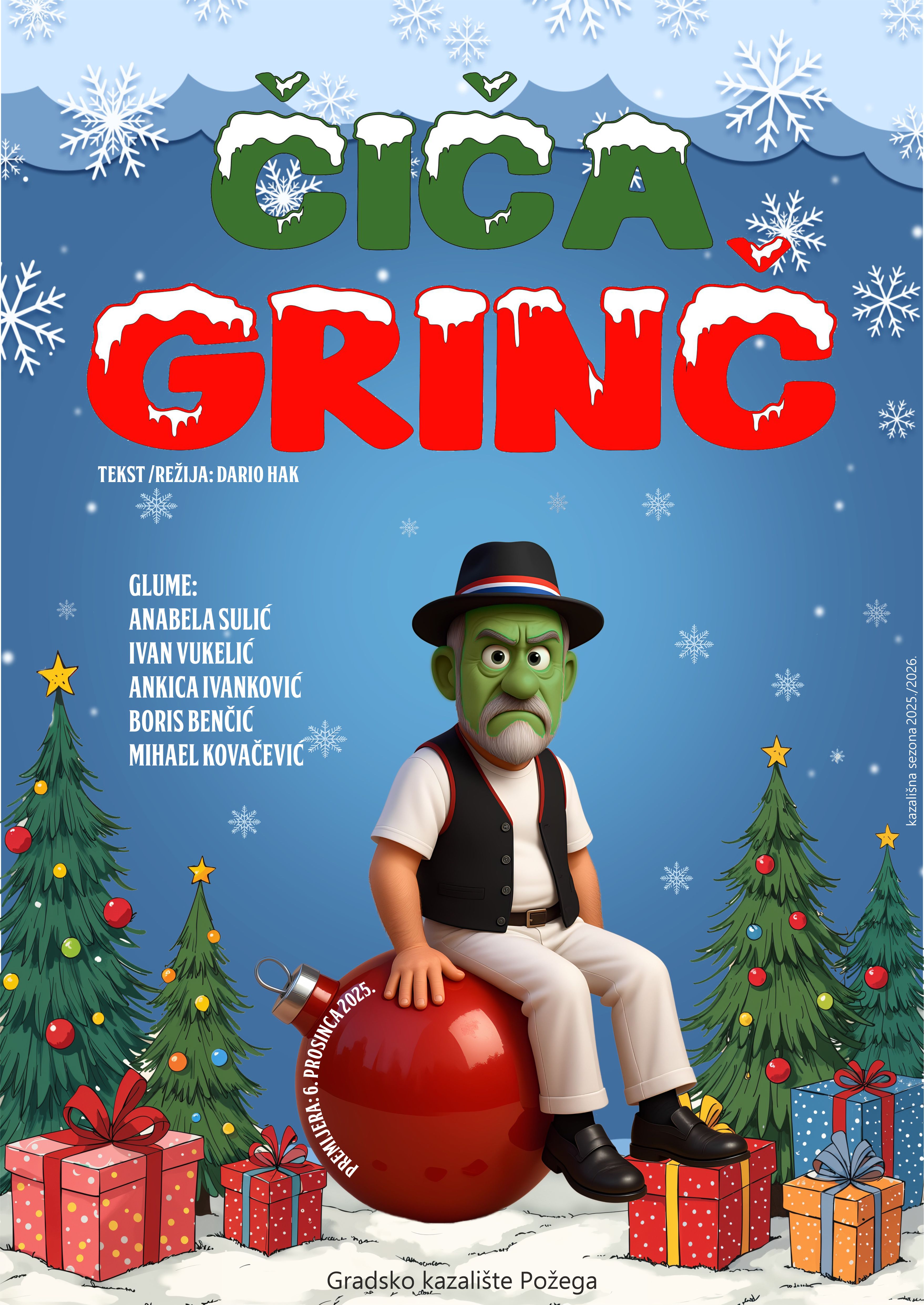 O PREDSTAVI: "Čiča Grinč" (Slavonski Grinč) je vesela i dirljiva božićna predstava o čiča Grgi, starom gunđalu koje je odlučilo pokvariti blagdane u svom selu. No, uz pomoć djece i bake Mare, Grga otkriva da pravo veselje Božića ne dolazi od darova ni ukrasa, nego od dobrote i zajedništva. Kroz smijeh, pjesmu i starinske običaje, publika ulazi u toplu slavonsku bajku punu emocije i duhovitih obrata...
